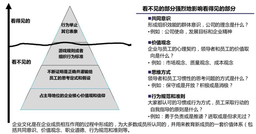 三层次文化诊断模型,结合了奎因模型、敬业度调查、企业运营管理综合诊断等多种诊断方法,能够对企业文化进行定性、定量两个层次的评估,同时,能够进一步揭示影响文化的背后的管理因素(如:战略、公司治理、组织架构等),从而帮助企业从根源上解决文化问题。