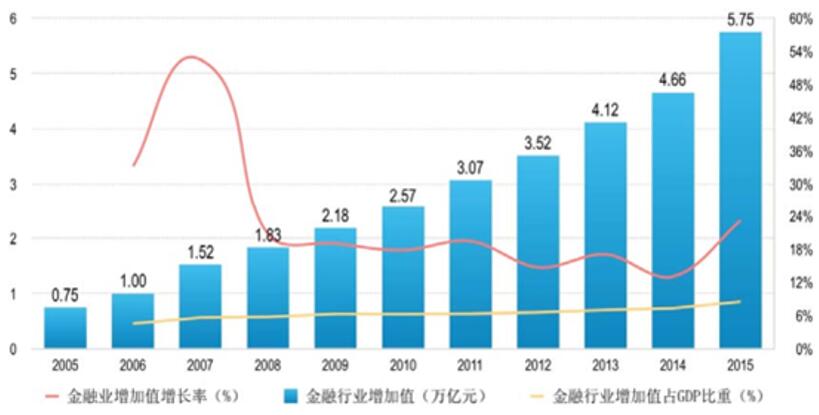 根据国家统计局数据,2009 年,我国金融业年增加值首次突破 2 万亿元,截至 2015 年我国金融业增加值已达 5.75 万亿元,占国内 GDP 比重的 8.50%。2008年以来,我国金融业产业增加值保持着近 20%的持续增长,占 GDP 的比例从 2005年的4.02%稳步上涨至 2015 年的 8.50%。金融业在国民经济中扮演着越来越重要的角色,金融业的快速增长及其对 GDP 贡献比例的提高,意味着金融行业的体量不断扩大,对国民经济发展的作用越来越突出。