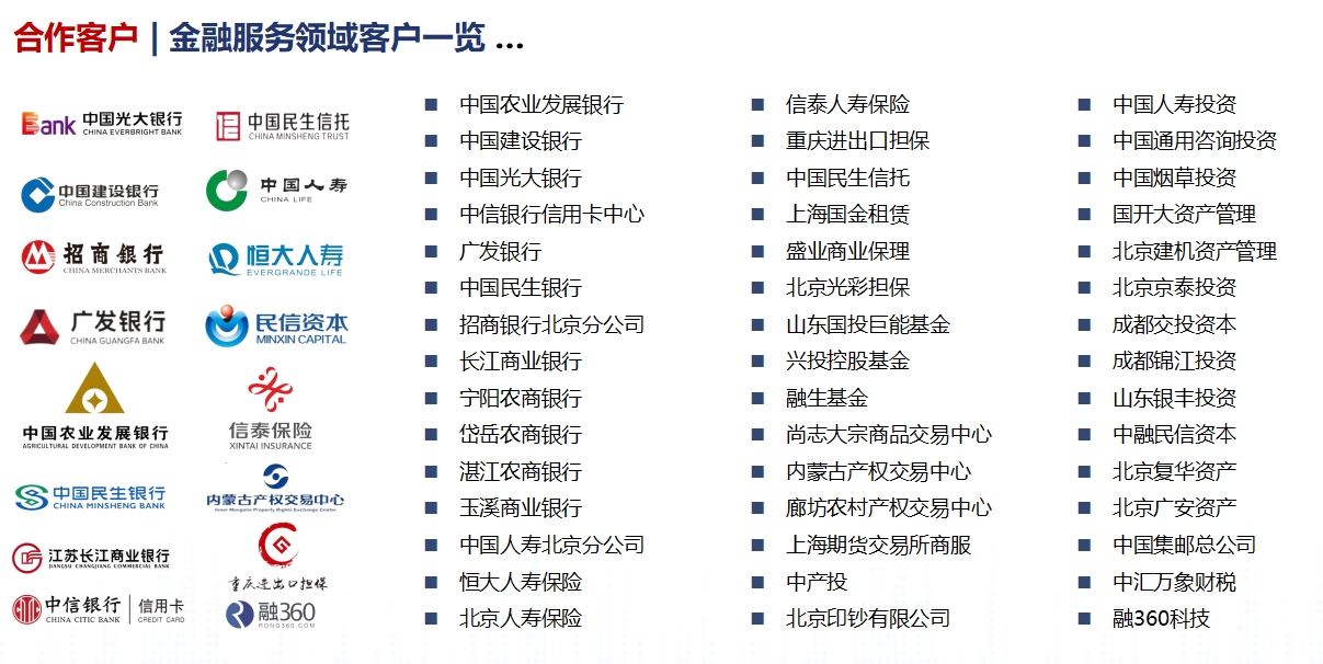 伟德国际betvlctor1946在金融行业的客户以银行业为主,涉及国有大型银行、股份制银行、城商行、农商行等,同时也涉及保险、担保、信托、基金、大宗商品、资产管理、互联网金融等各类非银金融机构,如:国寿投资、京泰投资、国投巨能基金、民生信托、重庆进出口担保、中国人寿北京市分公司、尚志大宗产品交易中心、融360、中汇万象财税等多家金融企业。