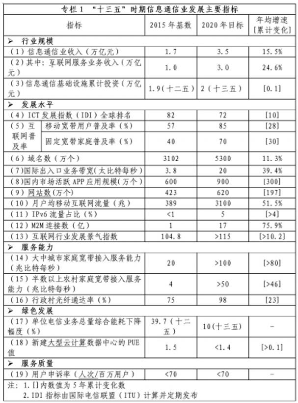信息通信业整体规模进一步壮大,到2020年,综合发展水平大幅提升,“宽带中国”战略各项目标全面实现,基本建成高速、移动、安全、泛在的新一代信息基础设施,初步形成网络化、智能化、服务化、协同化的现代互联网产业体系,自主创新能力显著增强,新兴业态和融合应用蓬勃发展,提速降费取得实效,信息通信业支撑经济社会发展的能力全面提升,在推动经济提质增效和社会进步中的作用更为突出,为建设网络强国奠定坚实基础。