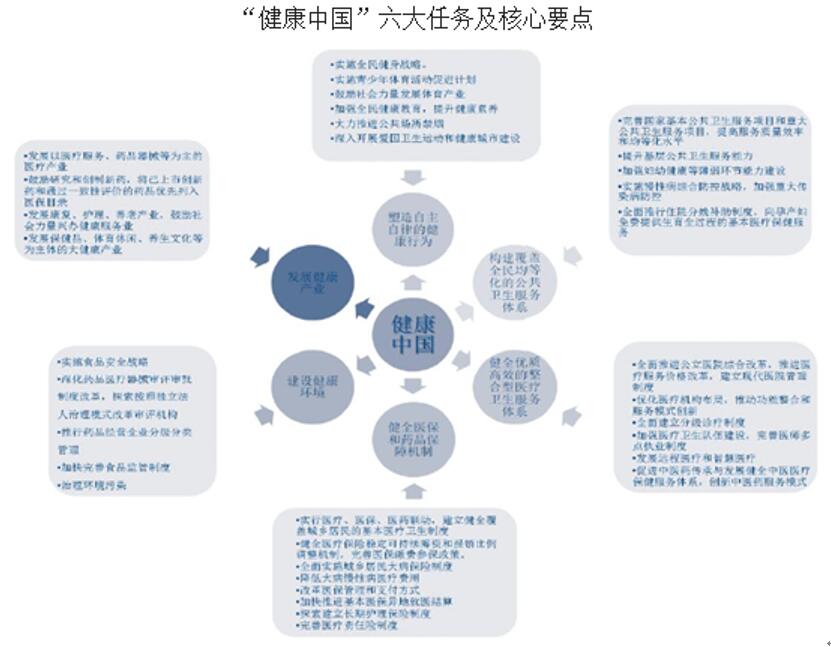 2016年10月25日国务院印发《“健康中国2030”规划纲要》,这是史上首个且最高规格的健康产业规划,从普及健康生活、优化健康服务等六大任务出发对未来15年的健康工作进行了部署,其中中医药、家庭医生及分级诊疗、康复与养老、药品器械的创新及供应保障、“互联网+医疗”以及ICL、医疗影像、血透等新兴业态成为关注重点,医疗健康产业迎来全面利好。