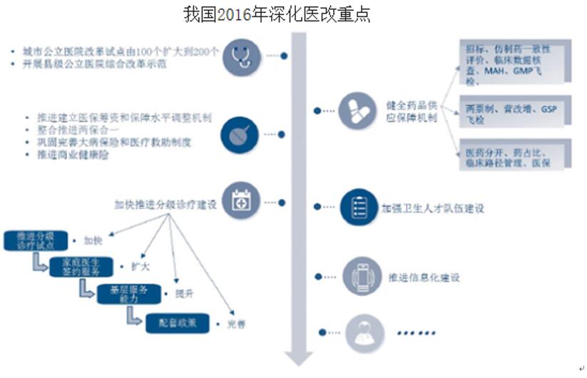 我国《“十三五”规划纲要》明确指出要从全面深化医药卫生体制改革、健全全民医疗保障体系、加强重大疾病防治和基本公共卫生服务、加强妇幼卫生保健及生育服务、完善医疗服务体系、促进中医药传承与发展等八个方面全面推进健康中国建设,其中医改是满足健康需求的根本性手段。