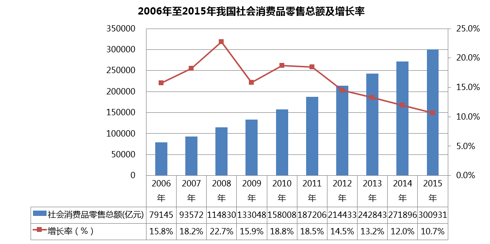 自2006年开始的十年间,我国的社会消费品零售总额逐年稳定增长,但增速在逐渐下滑。