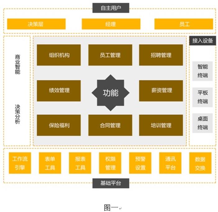 其中,整个方案以组织机构管理、人员管理、考勤休假管理、薪资管理、绩效考核、社保管理、合同管理、招聘管理、培训管理、报表中心、自助服务为核心功能模块,是企业管理层、HR和员工全员参与的,适合企业进行多层次管理的人力资源管理系统整体解决方案。