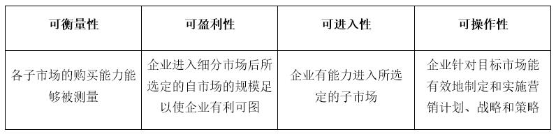 1. 可衡量性:目标市场的销售潜力及购买力的大小能被衡量。