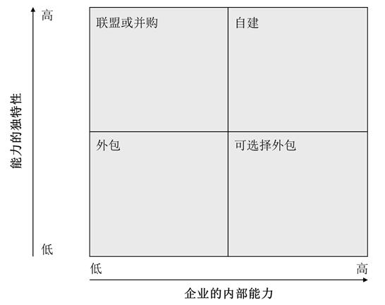 3. 通过什么途径实现:战略具体通过什么样的途径(如:内部自建、联盟或外包等)来实现。在这方面,可以运用“企业内部能力和外部能力独特性”模型选择战略实施的策略和方式。如图3所示。