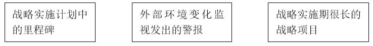 1. 战略实施计划中的里程碑。即:将整个战略实施过程划分为几个阶段,每一阶段都标志着战略推进的一个里程碑,也就是说,要对战略实施计划的每一阶段进行评审,一般在战略实施开始就把阶段评审时间列入计划,这样就可以有的放矢地收集有关信息、情报。