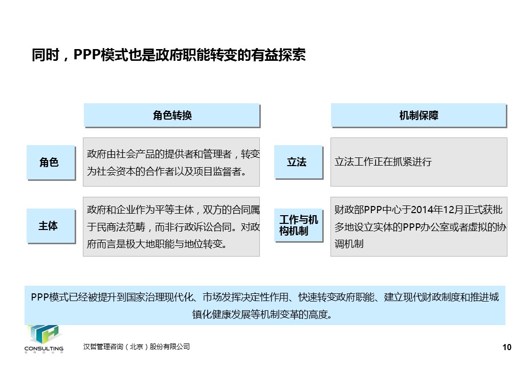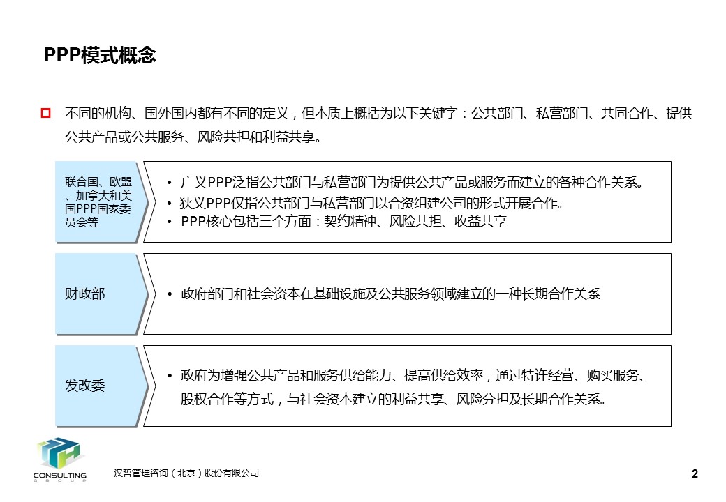 PPP模式,即政府和社会资本合作,是公共基础设施中的一种项目运作模式。在该模式下,鼓励私营企业、民营资本与政府进行合作,参与公共基础设施的建设。不同的机构、国外国内都有不同的定义,但本质上概括为以下关键字:公共部门、私营部门、共同合作、提供公共产品或公共服务、风险共担和利益共享。