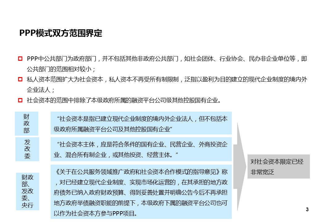 PPP中公共部门为政府部门,并不包括其他非政府公共部门,如社会团体、行业协会、民办非企业单位等,即公共部门的范围相对较小;私人资本范围扩大为社会资本,私人资本不再受所有制限制,泛指以盈利为目的建立的现代企业制度的境内外企业法人;社会资本的范围中排除了本级政府所属的融资平台公司级其他控股国有企业。