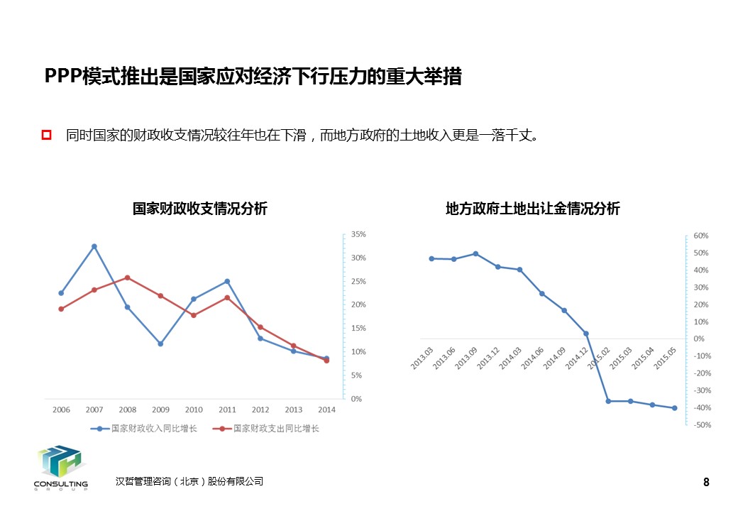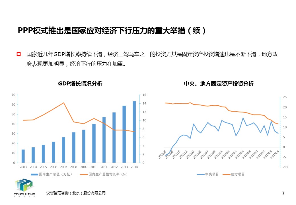 1、PPP模式推出是国家应对经济下行压力的重大举措:国家近几年GDP增长率持续下滑,经济三驾马车之一的投资尤其是固定资产投资增速也是不断下滑,地方政府表现更加明显,经济下行的压力在加重。