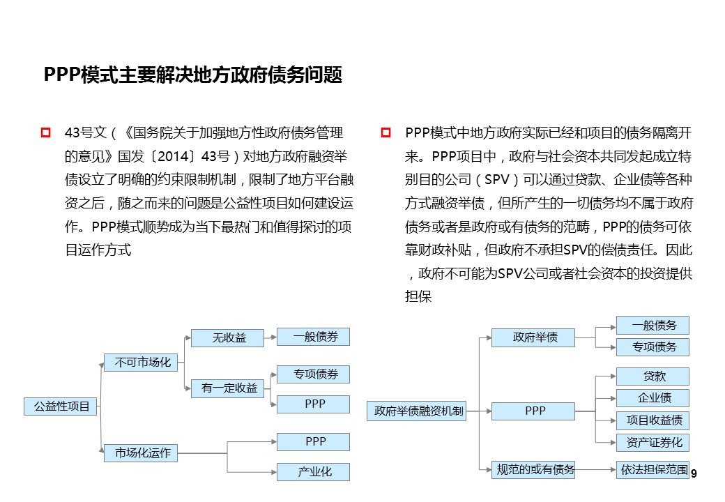43号文(《国务院关于加强地方性政府债务管理的意见》国发〔2014〕43号)对地方政府融资举债设立了明确的约束限制机制,限制了地方平台融资之后,随之而来的问题是公益性项目如何建设运作。PPP模式顺势成为当下最热门和值得探讨的项目运作方式。