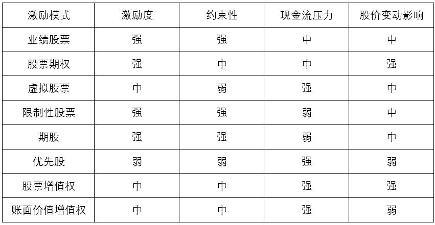 业绩股票、股票期权、虚拟股票和股票增值权、账面增值权等期权类激励模式的机理是一种价格激励,“公司请客、市场买单”的特点能很好地激励管理人员的创新与冒险精神,但也有可能给公司带来风险;而限制性股票、期股等激励模式“收益共享,风险共担”的特点能引导管理人员努力工作,使企业稳健发展避免过度风险。