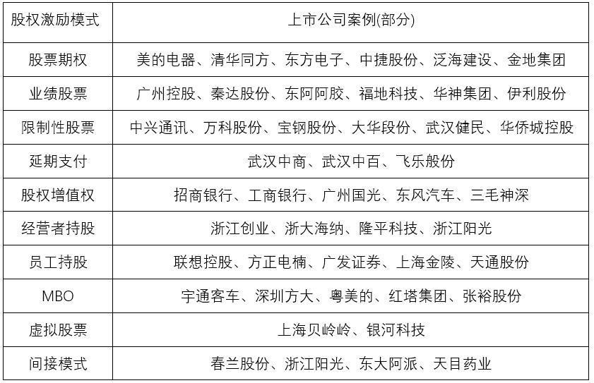 需要说明的是,上表看似激励模式类型很多,实际上有些并不是真正的激励模式,如“员工持股、经营者持股”是一个激励对象的概念而不是激励手段的概念;还有些是上市公司实施的一些不需证监会审批、仅股东大会表决通过即可以实施的一些变通的激励方案。