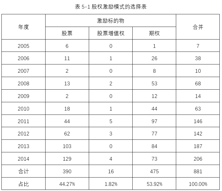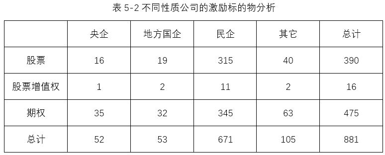 对于不同性质的上市公司来说,其选择股权激励标的物的偏好基本一致,总体来说都是偏好股权激励,其次为股票激励,最后有较少的股票增激励(如表5-2所示)