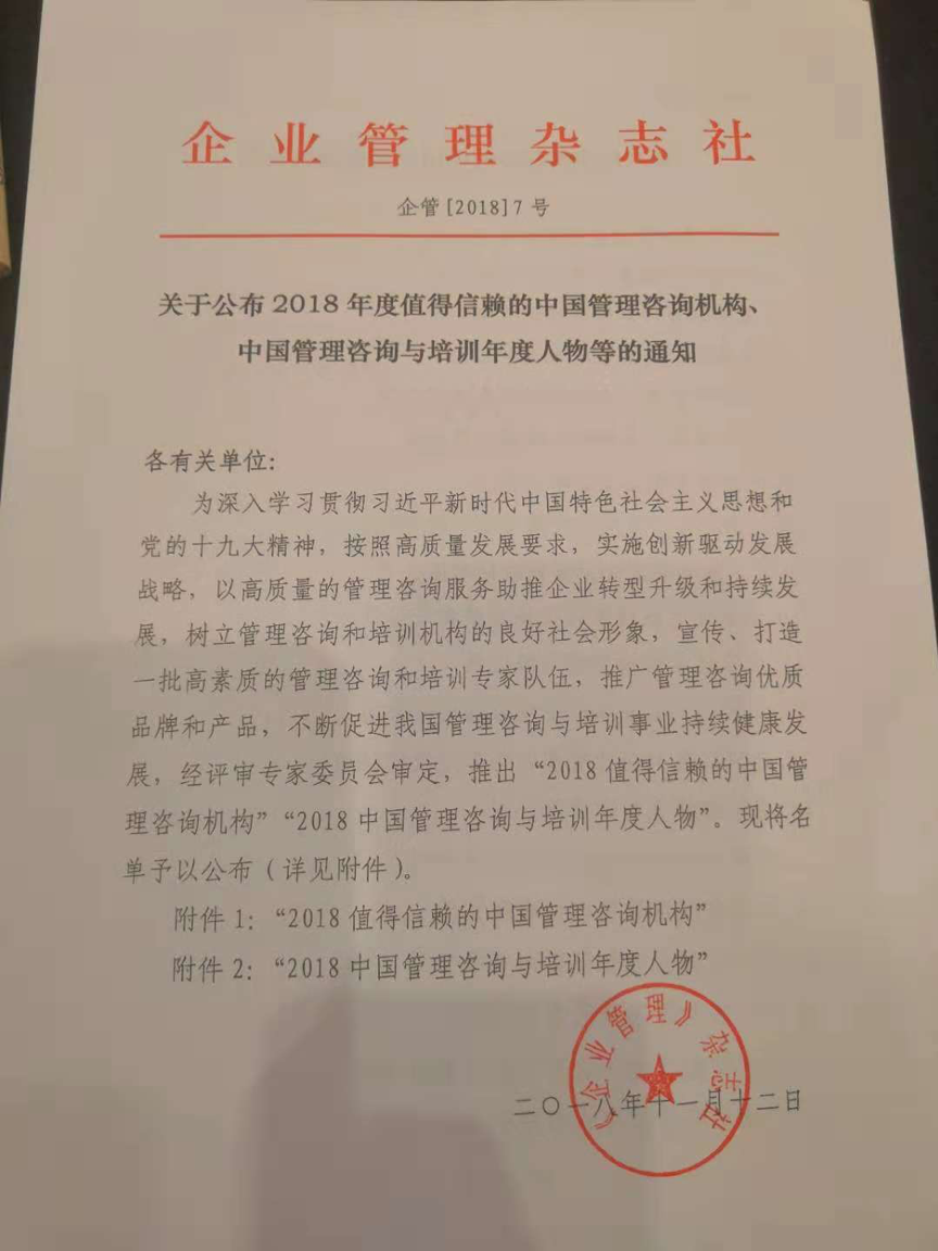 作为行业的领军企业,伟德国际betvlctor1946咨询再次入选“全国企业管理咨询机构推荐名录”,并荣获“最受信赖的中国管理咨询机构”,“中国管理咨询机构50大”荣誉称号。