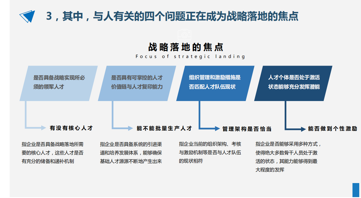 在人才管理策略规划方面,强调以战略为起点,通过战略解码对人才管理任务进行层层分解,针对每一项任务,再具化为可落地、可操作、可衡量的重点工作,并借助于考核体系进行目标传导和推动。