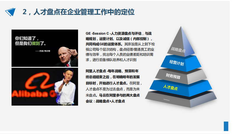 在GE、阿里等企业,“人才盘点”作为与“战略盘点”比肩而立的一项重要工作,获得CEO的高度重视与深度参与。人才盘点之于企业的意义,在于它能够帮助企业对人才资源进行有效的识别、使用和储备,促进人才的战略性配置;之于个体的意义,在于它能够帮助员工个体认识能力的优劣,扬长补短,发展提升。