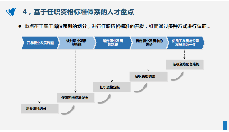 基于任职资格的人才盘点,强调基于岗位/岗位序列的关键职责进行知识、技能、能力、素质、业绩等综合资质的萃取与评价,更加强调任职者综合资质与所承担的职责之间的业务关联性。基于任职资格的人才盘点,一是有助于对战略实现所需要的能力进行超前规划;二是有助于知识萃取,将存在于少数员工心中、脑中的技能转化为组织智商,促进“学习型组织”的建设;三是有助于人才复制,即根据公司的知识地图、能力地图,批量生产人才,在人才管理的整个链条中占有主动权。