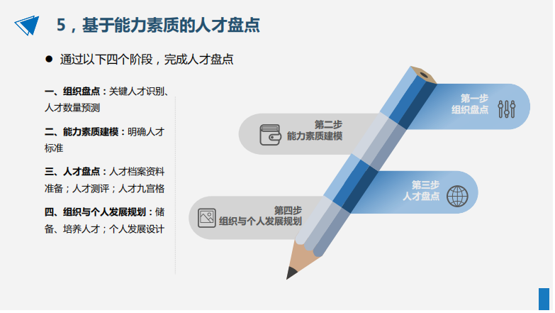 基于素质模型的人才盘点,侧重能力素质模型的开发并据此开展评鉴。这一盘点方式的优点在于快速便捷,同时也有利于外部大数据的参照和对比,同时,通过绩效、能力、潜质三要素的测评,能够帮助组织找到应当重点关注的人、需要淘汰清退的、应当重点培养的人,实现人才的区分和有效使用,而这一方法的缺点在于忽略了岗位的专业属性,能够评价人却无法知道如何帮助这个人成长和更好地适应岗位、创造更佳业绩。