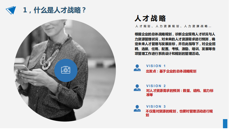 人才战略,是根据企业的总体战略规划,诊断企业现有人才状况与人力资源管理状况,对未来的人才资源需求进行预测,确定未来人才管理与发展目标,并在此指导下,对企业招聘、选拔、任用、配置、考核、激励、培训、发展等各项管理工作进行系统设计和规划的管理活动。