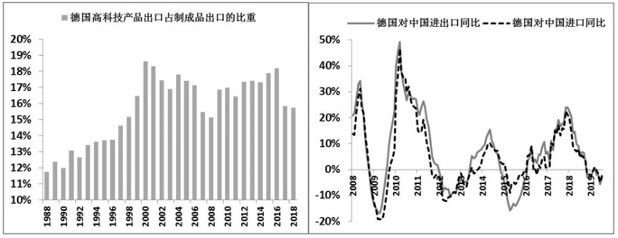 目前,全球制造业正处于工业化3.0的尾部,作为该阶段工业化强国的德国虽已于2013年提出了工业4.0,但工业化3.0的红利衰减还将对德国持续产生不利影响,例如,德国出口的高科技产品占其出口的制成品比重已经连续两年下降至16%,平均降幅是一年一个百分点;再例如,德国对华的进出口增速自2018年就持续处于下降趋势,至今年则已连续数月为负增长。