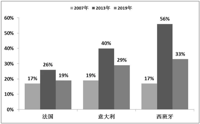 伴随经济增长内生动力的衰减,加之全球化红利的消失,之前掩藏在持续增长背后的社会福利分配不公平的矛盾相继水落石出,尤其是年轻人就业机会迟迟未见明显改善,更是助推了全球范围内民粹主义的蔓延和激化。以法国、意大利和西班牙的就业情况为例,目前三国低于25岁年轻人的失业率分别为19%、29%和33%,虽较欧债危机时期的峰值有所回落,但依然高于危机前的水平。