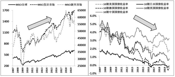 本次危机的复苏,很大程度上得益于金融市场持续乐观的情绪。例如,自2009年2月份全球股市触底回升以来,至今MSCI全球指数累计上涨了190%、MSCI发达市场指数累计上涨了200%、MSCI新兴市场指数累计上涨了154%;与此同时,全球利率水平持续走低(债券利率走低意味着债券价格上涨),平均累计下降幅度超过了200BP,尤其欧洲和日本等地区已形成了负利率趋势,全球负利率债券规模一度接近18万亿美元。由此,本次危机复苏之后,在低利率环境的乐观情绪推动下,全球金融市场始终处于上涨态势。
