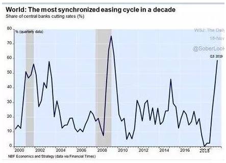 今年以来,制造业下滑、贸易纷争继续、收入分配矛盾激化以及地缘政治风险凸显等多因素叠加影响,包括美国和中国在内的全球经济增长主要贡献者均不同程度地面临经济下行压力,所以今年3月份之后,全球货币政策再次同步宽松,截至目前全球已有近60%的央行采取了降息等宽松政策。在2008年金融危机爆发后,全球最多有近80%的央行实施了宽松政策。但与当年不同的是,各国在应对本次全球金融危机的过程中,已耗用了很多政策空间,由此严重制约了各国再次宽松的政策实际空间,从而会削弱市场对于央行的信仰。再考虑到单边主义、民粹主义和全球化逆潮在短期内只会强化、不会弱化,因而当前全球经济的下行趋势能否被遏制,存在很大不确定性。