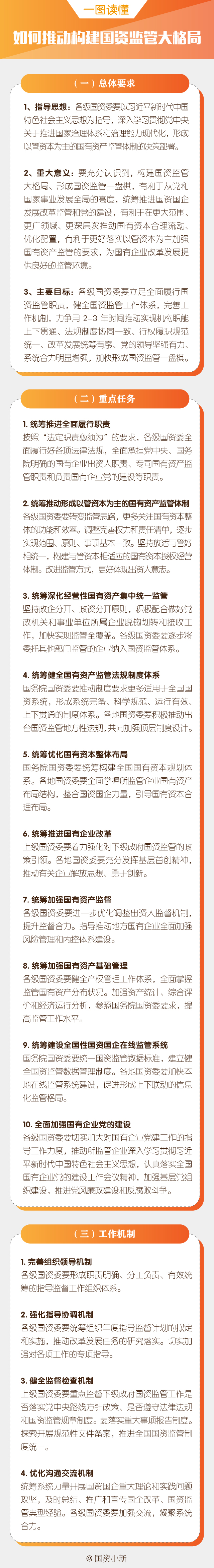 《通知》强调,构建国资监管大格局的重点任务是,按照“法定职责必须为”的要求,统筹推进全面履行职责;转变监管思路,统筹推动形成以管资本为主的国有资产监管体制;坚持政企分开、政资分开原则,统筹深化经营性国有资产集中统一监管;加强顶层制度设计,统筹健全国有资产监管法规制度体系;落实国家发展战略,统筹优化国有资本整体布局;围绕培育具有全球竞争力的世界一流企业,统筹推进国有企业改革;聚焦防止国有资产流失,统筹加强国有资产监督;全面掌握国有资产分布状况,统筹加强国有资产基础管理;强化事中事后监管,统筹建设全国性国资国企在线监管系统;坚定维护党中央权威和集中统一领导,全面加强国有企业党的建设。