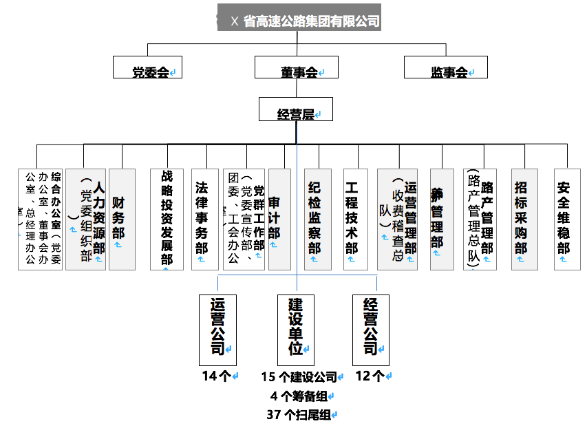 组织与编制:从相关行业和区域企业对标及企业未来业务发展需要两方面综合考虑,对集团总部组织结构进行优化,如:考虑到未来新建高速公路逐渐减少的具体情况,在工程管理部和道路养护部的编制设计上预留出调整空间,确保随着业务发展和变化,工程管理部门人员向道路养护部门的顺利平移;在运营公司和建设公司的编制设计方面,分别通过对车道数、车流辆和公里数、投资额等具体数字的精准测算明确岗位编制;而在经营公司的编制设计上,则根据其具体业务情况给予一定的自主权,总公司对编制情况不做具体设计,仅行使编制审批权。