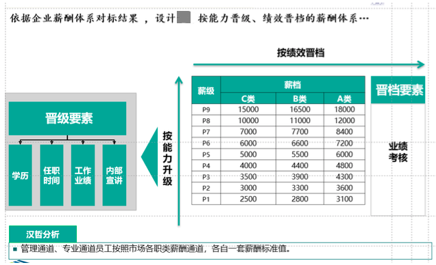 1、对标典型互联网企业薪酬模式及薪酬结构。研究分析阿里、腾讯、百度、华为四家公司的薪酬模式及薪酬结构,结合公司实际情况,对员工能力进行评估,按照能力晋级,绩效进档的方式设计能力薪酬体系,构建公司自己特点的薪酬体系。