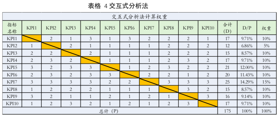(2)从横向上把每个指标相比较的分值加总为D,把所有指标相比较的分值加总为P,将每个指标的合计分值除以所有指标加总的分值,即D/P,每个指标的权重取与D/P值接近的5的倍数。