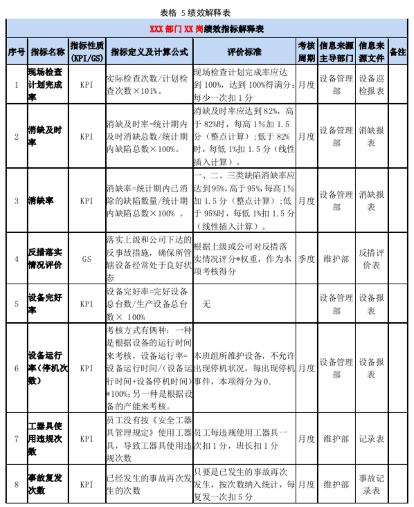 规范绩效解释表,明确指标名称标准、指标性质、指标定义及计算公式、评价标准、考核周期、信息来源主导部门、信息来源文件。定期对绩效解释表进行修订维护。