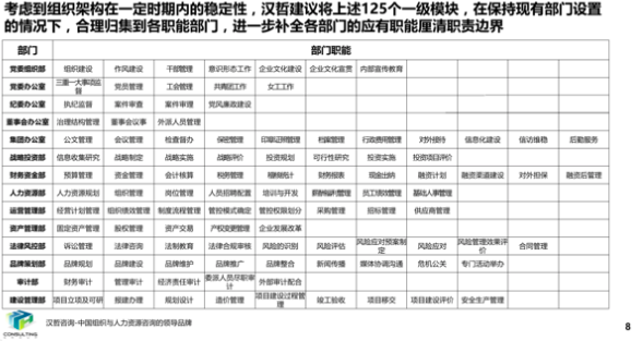 在集团组织结构优化与岗位“三定”优化过程中,通过分析集团总部现承载的职能模块并梳理各部门现有职能,结合企业实际需要,对职能模块进行了调整,避免多部门承载同职能模块导致的职能边界不清晰的情况。