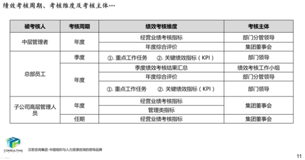 1、优化集团和子公司经营业绩考核办法。根据集团战略目标和子公司的功能定位、业务特点,集团总部实行年度考核,所属子公司实行年度考核与任期考核相结合的方式,遵循战略导向、团队导向、客观公正、分类考核的原则,制定各部门考核指标、考核程序、考核计分办法,形成经营业绩考核办法,提高激励作用,为实现集团战略目标夯实基础。