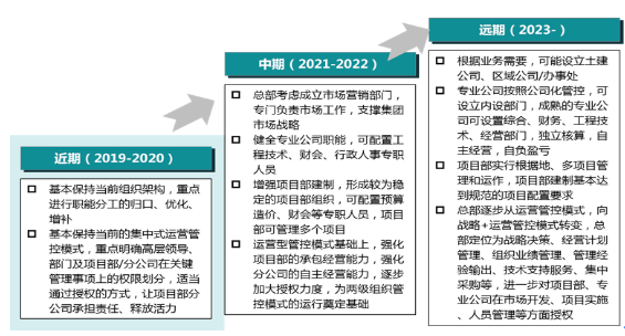 围绕公司的五年规划,提出其组织管控的三个阶段发展路线图,据此提出近期、中期、远期三个阶段的组织优化方案,细化近期和中期的部门职责划分。