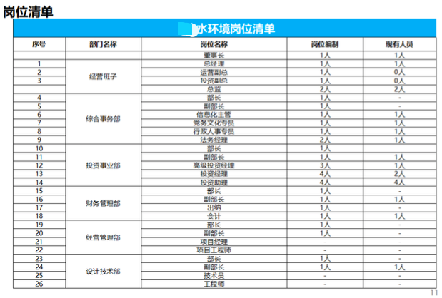 通过对部门职责、部门岗位、人员编制数、现有人数、缺岗人数、岗位职责对组织岗位进行梳理。