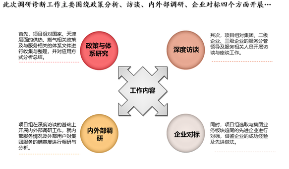 项目启动之初,通过政策与体系研究、深度访谈、内外部调研、标杆企业研究等维度进行全面诊断,发现问题并提出改进的思路。