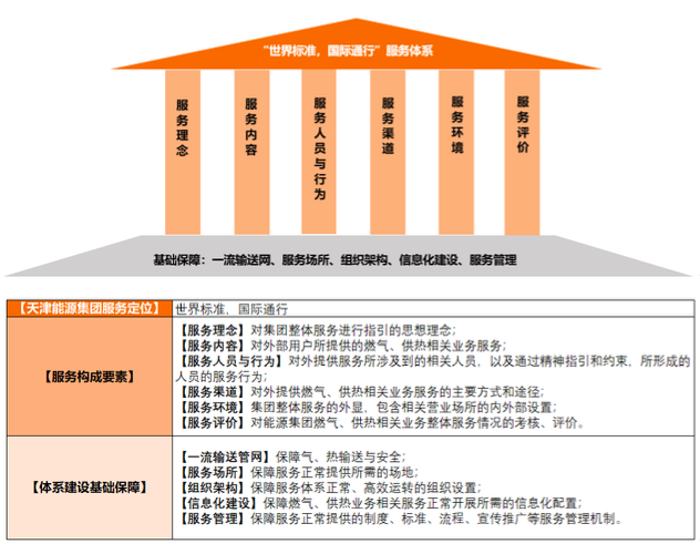 在服务体系框架搭建中,对集团内部服务燃气、供热服务,以用户体验为主线,进行服务全生命周期梳理,并提炼了服务理念、服务内容、服务人员与行为、服务渠道、服务环境、服务评价六大服务构成要素,在此基础上,搭建了能源服务保障体系框架。如下所示:
