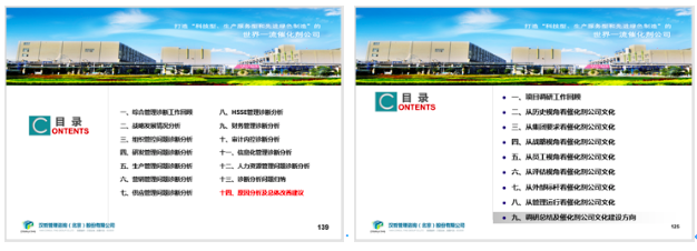 在深入调研、严谨分析基础上,全面撰写两个《诊断报告》。《管理综合诊断报告》从战略发展、组织管控、研发管理、生产管理、营销管理、供应管理、HSSE管理、财务管理、审计内控、信息化管理、人力资源管理共计11个维度,对公司管理进行了综合诊断。并结合公司发展现状,和最佳管理实践,针对性的提出49个具体管理问题,和8项综合改进举措。《文化诊断报告》从历史视角、集团要求、战略视角、员工视角、评估视角、外部标杆、管理运行7个方面对企业文化进行了全面的诊断分析。
