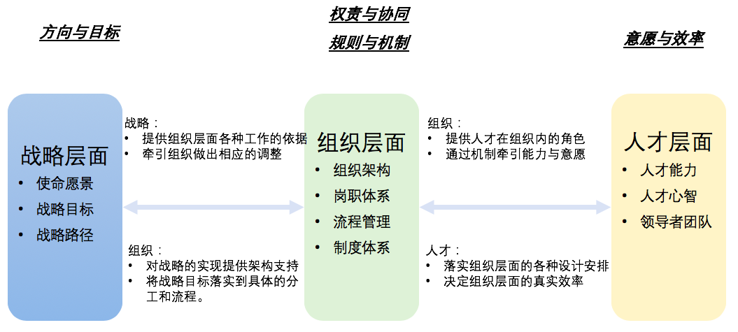 从上图可见,组织层面的各种设计,组织架构和管控,流程设计、各种制度,也包含人力资源相关的考核、薪酬、干部管理、劳动关系与用工、招聘配置等等的具体规则,既承接了战略目标,为具体的战略实现服务,也需要随着战略的调整而调整,同时,组织层面的各种设计,也决定了对人才的具体角色要求,角色要求既代表着对人才标准的要求,同时也通过各种流程制度形成机制牵引着人才能力的发挥和心智的改善,当然,人才层面的各种要素的表现水平也直接影响者组织层面各种设计的实际运行效率,并且有可能倒逼组织层面进行相应的调整,比如人才能力不能支持组织层面的设计,或组织层面的设计无法充分发挥人才的能力时。所以人才管理体系设计的重点就在于如何在组织层面通过制度设计,配合相应的工具方法,最终在人才层面达到想要的结果,从而将战略层面与人才层衔接起来。