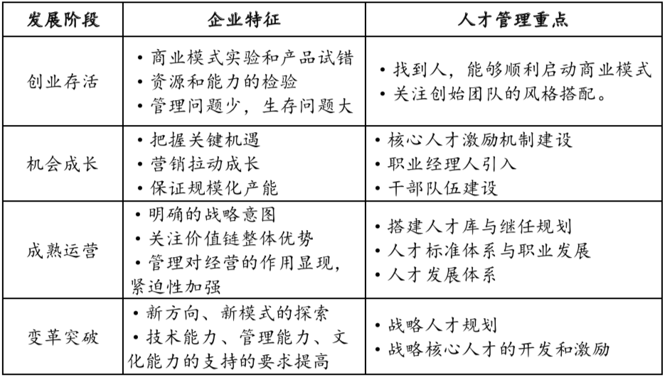 第一:保持与企业发展阶段的适应性:企业不同的发展阶段,经营的中心不一样,相应人才管理所需要解决的核心问题也就不同,借用爱迪斯的企业生命周期理论,将衰退期理解为变革转型期的基础上,将各阶段人才管理的重点如下: