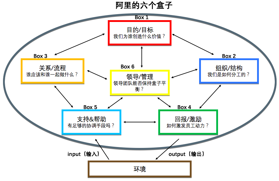 麦肯锡7S模型对成功企业的定义中,战略、结构和制度是 “硬件”,风格、人员、技能和共同价值观则是与人才相关的“软件”,作为韦斯伯德六个盒子中国实践版的阿里六个盒子,除了考虑了“回报/激励”这个与人才直接相关的维度,更是将团队领导者的因素做了诊断的中心问题。