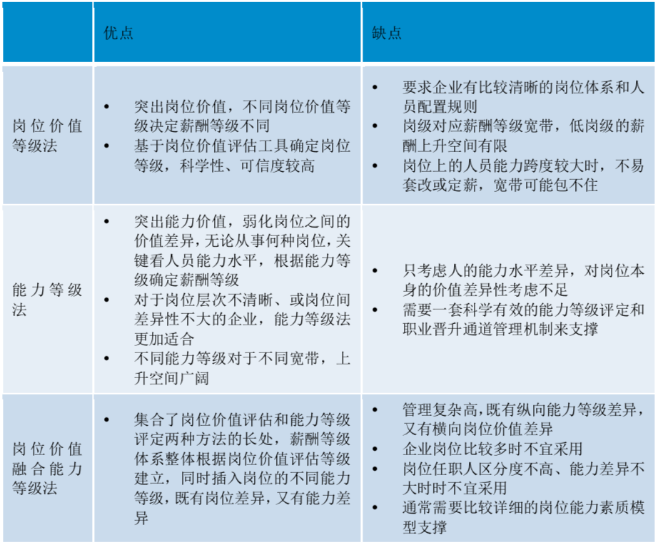 那么薪酬等级体系如何搭建,有什么依据呢,有哪些搭建思路和方法呢?这里就给大家介绍万变不离其宗的三种薪酬等级体系搭建模式,分布是岗位价值法、能力等级法、岗位融合能力等级法,市面上绝大多数的企业薪酬等级模式,都基于这三种模式的一种而形成,无论多么复杂花哨的薪酬等级体系,也逃不出这三种模式原型。