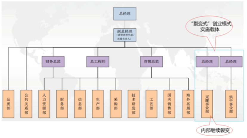 3、通过“裂变式”创业形成职能+事业部部式的混合组织形式。