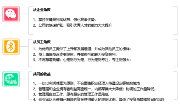 1、母公司创始人控股新公司,同时收益权上充分激励创业团队;创业团队成员必须掏钱参股,以身家性命赌未来。