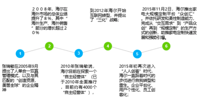 人单合一自主经营模式就是在海尔为了企业内部组织架构能适应外部国际化市场的变化这一标准下,在内部开展组织管理体制和业务流程再造的情况下诞生和发展的。