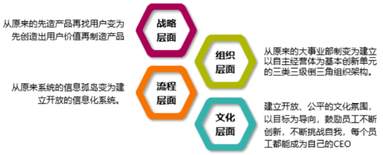 对外紧跟时代发展,以创造用户需求为导向持续进行管理创新;对内以人为本,在企业内部建立起一种公平高效的机制,为员工搭建一个“我的用户我创造,我的增值我分享”的自我实现平台。具体可分为四个层面。