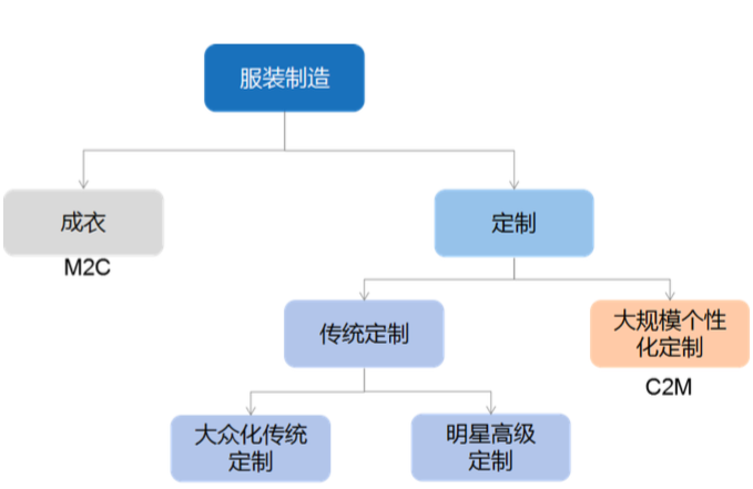在服装生产模式中,主要分为以下几种方式:大的类别上,可以分为“成衣”和“定制”,在定制中又进一步细分为“传统定制”和“大规模定制”,酷特智能业务经营模式即属于“大规模定制”。