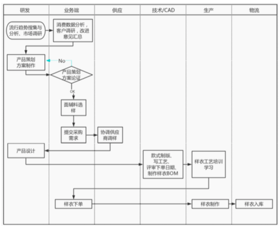 1. 服装产品的企划、设计及研发。服装产品的设计开发以企划中心为主导,由业务、供应、技术、生产等部门共同参与决策。从趋势信息收集到新产品样衣完工的整体流程如下图所示。